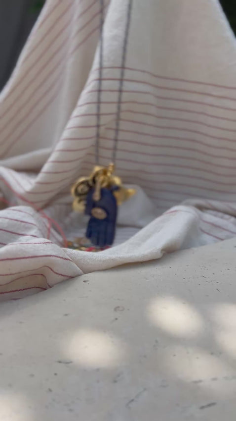 perles et médailles enchevêtrées les unes aux autres . Comme un Symbole Découvrez notre talisman bleu, un collier enchevêtré de médaillons au charme envoûtant. Un grigri incroyablement élégant, orné de pierres précieuses, réglable pour un ajustement parfait. Parfait pour une touche de grâce et de sophistication à votre tenue, avec son cordon bleu marine délicat., un grigri qu’on garde auprès de nous. ,